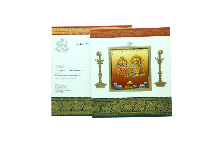 | Description | White card & cover with saree border in top red with gold foil and in bottom green with gold foil in center padmavathi balaji sticker with kuttuvilaku |