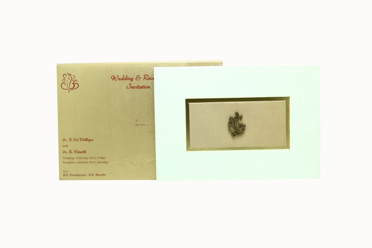 | Description | Gold cover with white colour card window in the center with golden satin with ganesha sticker |