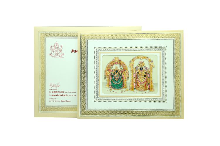 | Description | Buff card & cover with gold foil border with window cutting padmavathi & balaji inside ohp sheet |