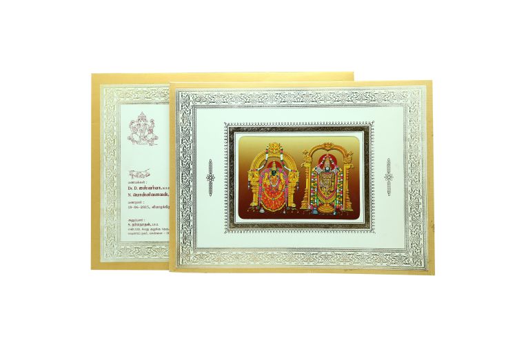 | Description | White card & cover with gold border with gold foil work and in the center padmavathi balaji in the frame |